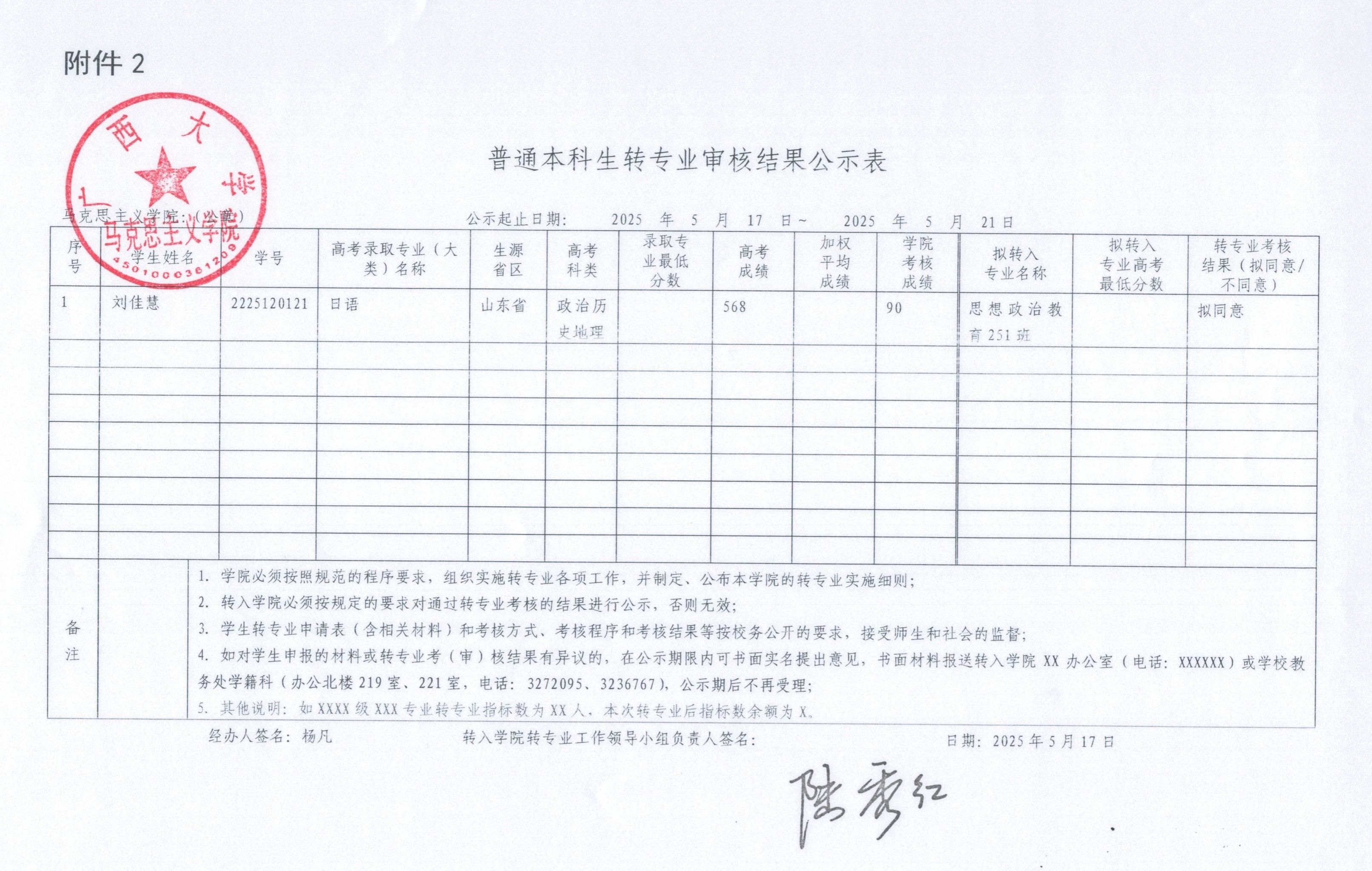 普通本科生转专业审核结果公示表