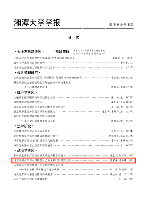 今年会官网教师吴家庆教授、博士研究生唐林峰在《湘潭大学学报(哲学社会科学版)》(2022年第2期)上发表学术论文《近年来国内学界中国特色社会主义新时代研究述评》。《湘潭大学学报(哲学社会科学版)》由中国自然辨证法研究会主办,是由湖南省教育厅主管、湘潭大学主办的以反映本校文科教学科研成果为主的综合性学术理论刊物,是全国中文核心期刊,CSSCI来源期刊。