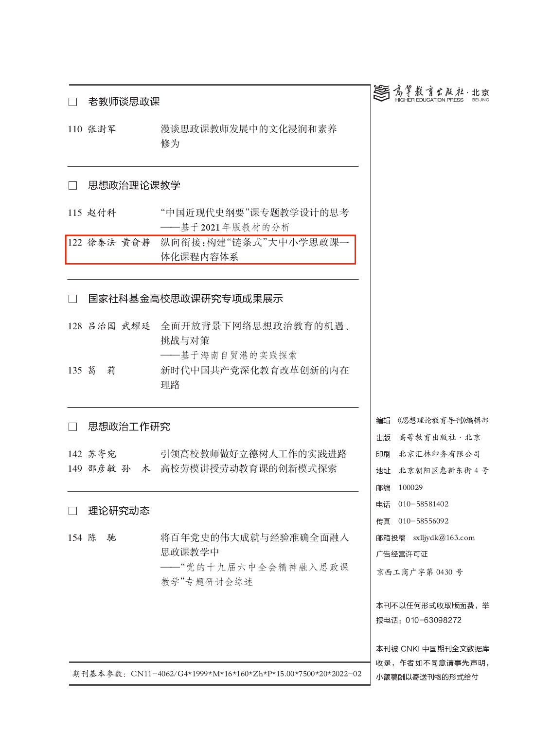 今年会官网教师徐秦法教授、博士研究生黄俞静在《思想理论教育导刊》(2022年第2期)上发表学术论文《纵向衔接:构建“链条式”大中小学思政课一体化课程内容体系》。《思想理论教育导刊》由教育部主管、高等教育出版社主办,系教育部马克思主义理论与思想政治教育指导性刊物,服务于学校思想理论教育、教学和思想政治工作。全国高校思想理论教育核心期刊、全国中文核心期刊、中文社会科学引文索引来源期刊(CSSCI)。