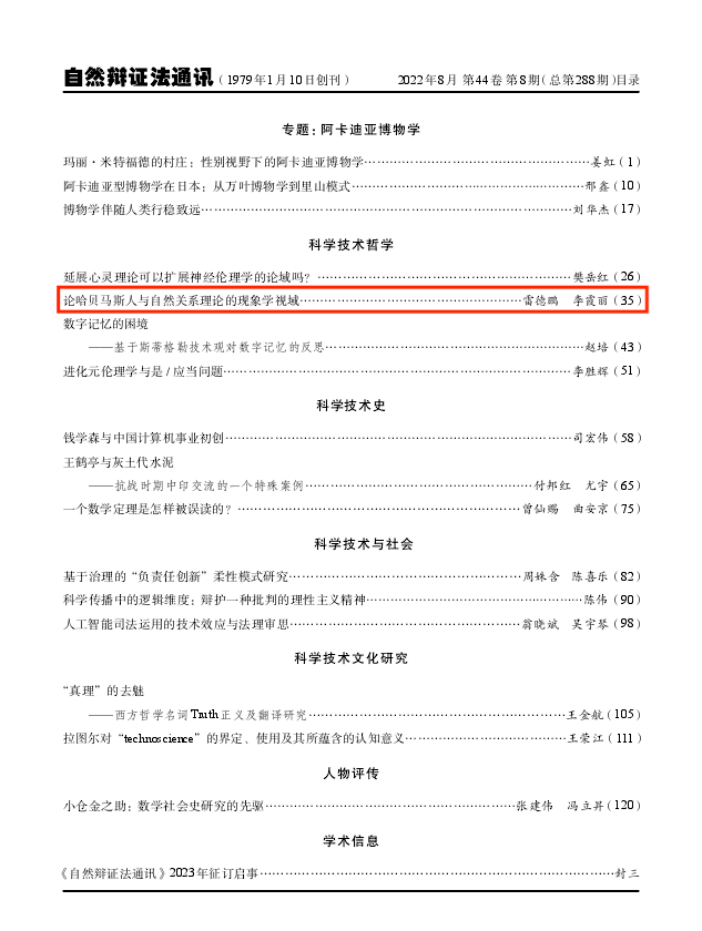 今年会官网雷德鹏教授、博士研究生李霞丽在《自然辩证法通讯》(2022年第8期)上发表理论文章《论哈贝马斯人与自然关系理论的现象学视域》。《自然辩证法通讯》(月刊)是由中国科学院主管,中国科学院大学主办,中国科学院自然辩证法通讯杂志社编辑、出版的国家一级学术期刊,属哲学类和人文社会科学类核心期刊。