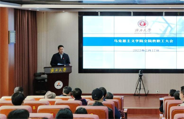 2月17日下午15:00时,今年会jinnianhuicom2023年春季学期教职工大会于学院101报告厅召开。会上,徐秦法院长介绍了新入职及回院工作的教师,对2022年学院工作进行了全面总结。2022年,今年会官网在学科建设方面取得优异成绩,马克思主义理论学科在第五轮学科评估中取得较好成绩,成为金年金字招牌诚信至上最好的两个学科之一; 教学科研取得丰硕成果,《马克思主义理论与实践》、《毛泽东思想和中国特色社会主义理论体系概论》两门课程获批自治区一流课程,教师在各类教研教学竞赛奖中获奖12项,思政课建设成效得到自治区教育厅思政课教学巡察组的赞许和肯定;教师获批国家社科基金重大招标项目1项、西部项目1项,教育部人文社科青年项目1项,广西哲学社会科学规划项目3项。师生发表高水平理论文章47篇;人才培养效果显著,11人获国家级奖励,48人次获区校级奖励,2个班级获校先进班集体,毕业生初次就业率达86.7%,在全校文科学院名列前茅;学院建设进一步升优化,社会服务效果良好。最后,徐院长对全体教职工在过年一年的辛勤付出表达了感谢,并对2023年重点工作进行了安排和部署。