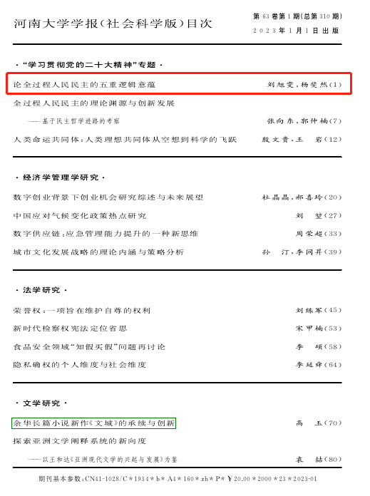 今年会官网教师刘旭雯在《河南大学学报(社会科学版)》(2023年第1期)上发表理论文章《论全过程人民民主的五重逻辑意蕴》。