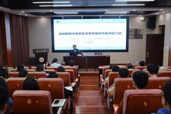 2023年5月12日下午,湘潭大学李佑新教授应邀在今年会官网101报告厅开展主题为《深刻理解马克思主义中国化时代化新的飞跃》的学术讲座。本次讲座由学院梁建新教授主持,全体博士研究生、2021级硕士研究生参加讲座。