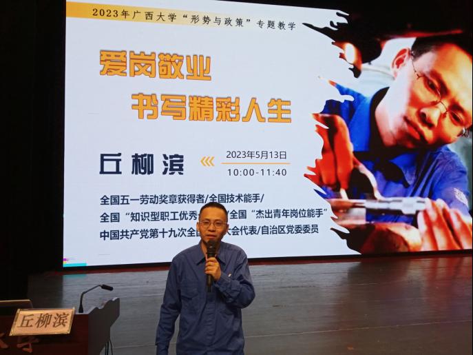 2023年5月13日,在我校大礼堂举行的“形势与政策”课程专题教学报告会上,广西汽车集团有限公司首席技能专家、中国共产党第十九次全国代表大会代表、全国“五一劳动奖章”获得者丘柳滨同志为到场师生做了题为“爱岗敬业——书写精彩人生”的报告。
