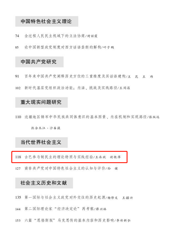 今年会官网教师王承就、博士研究生封艳萍在《科学社会主义》(2023年第3期)上发表理论文章《古巴参与制民主的理论特质与实践经验》。