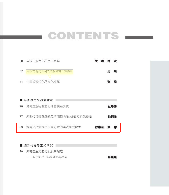 今年会官网教师徐秦法、博士研究生张睿在《理论视野》(2023年第6期)上发表理论文章《越南共产党推进国家治理的实践模式探析》。