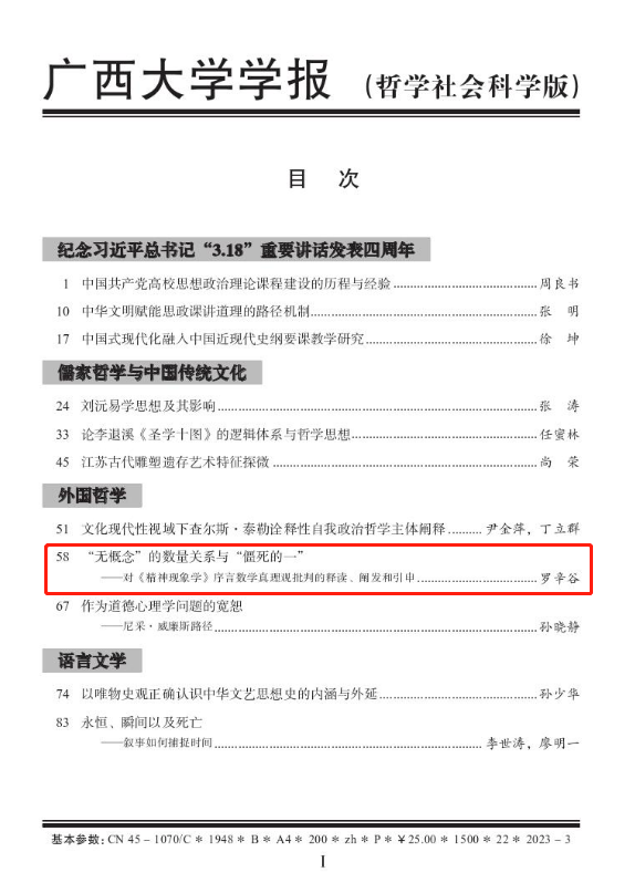 今年会官网教师罗辛谷在《金年金字招牌诚信至上学报(哲学社会科学版)》(2023年第2期)上发表理论文章《“无概念”的数量关系与“僵死的一”——对<精神现象学>序言数学真理观批判的释读、阐发和引申》。