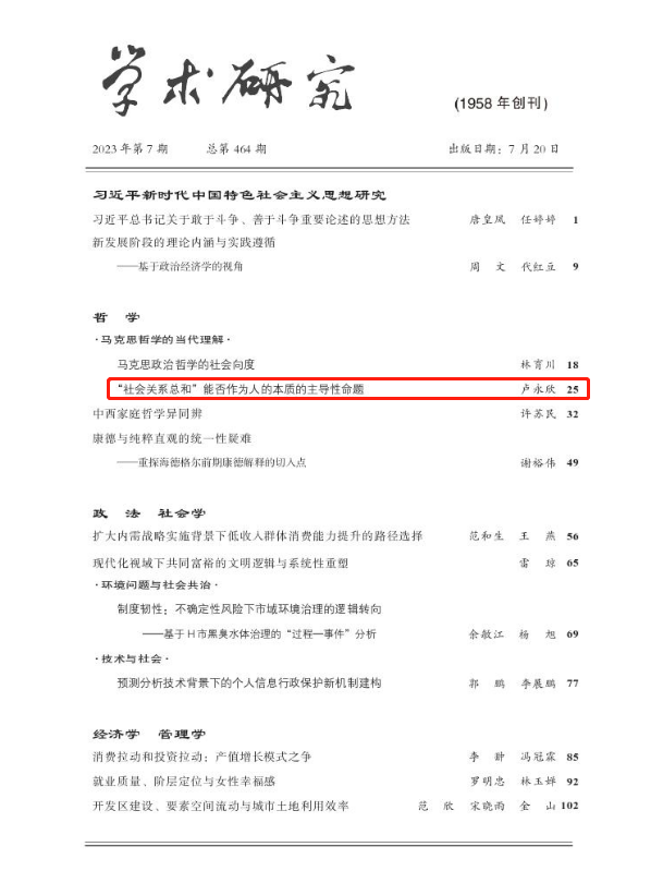 今年会官网教师卢永欣在《学术研究》(2023年第7期)上发表理论文章《“社会关系总和”能否作为人的本质的主导性命题》。