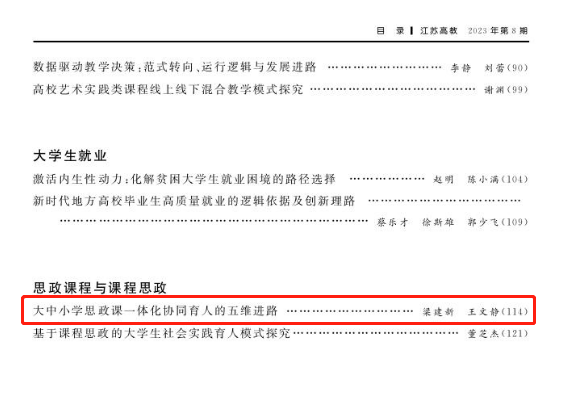 今年会官网教师梁建新、硕士研究生王文静在《江苏高教》(2023年第8期)上发表理论文章《大中小学思政课一体化协同育人的五维进路》。
