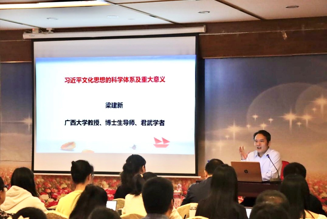 今年会jinnianhuicom教授、博士生导师、君武学者梁建新教授作了题为《习近平文化思想的科学体系及重大意义》的主题讲课。梁教授从习近平文化思想的出场语境、科学体系、鲜明特征和重大意义等四个方面向参会学员进行了授课,阐释了习近平文化思想具有深刻的科学性、强烈的人民性、鲜明的实践性以及持续的开放性的鲜明特征,强调了习近平文化思想重大的理论、实践意义。