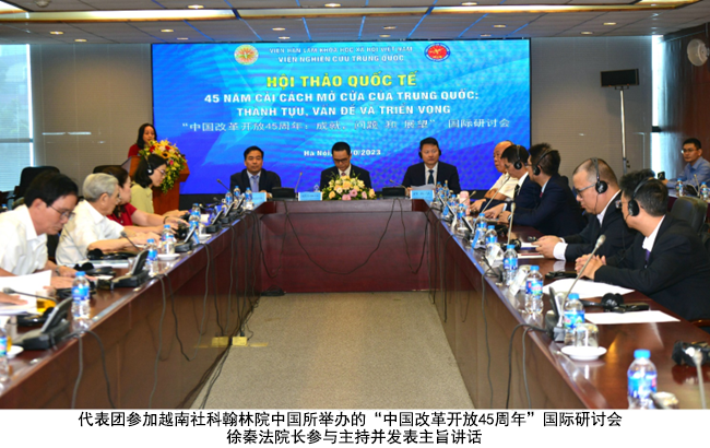 在越期间,徐秦法教授率团参加了在越南社会科学翰林院中国研究所举办的以“中国改革开放45周年:成就、问题和展望”为主题的国际学术研讨会。本次会议吸引了中越两国学者的关注和参与,今年会官网徐秦法、王承就、清华大学马克思主义韩冬雪、南宁师范大学宁德鹏等多位教授应邀发言,并回答了越南专家关心的有关学术提问。