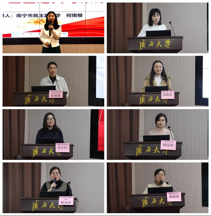 20日下午,来自南宁市民主路小学的何雨根老师、金年金字招牌诚信至上附属中学的祁春兰老师、广西艺术学院附属中等艺术学校的余甜甜老师、南宁市第三中学的邱丽燕老师、广西职业技术学院的张玉玲老师、广西医科大学的赖远妮老师、柳州市柳江区第二中学的陈金妮老师、贵港市高级中学的周绍玲老师分别代表小学、初中、中职、高中、高职、本科不同学段,以及语文、历史不同学科,以“同题异构:爱国主义”为主题进行了精彩纷呈的教学展示。教学展示后,李学勇教授对每位教师的教学情况给予了充分肯定,并逐一进行了精辟中肯的点评,提出了选取主题要精准、协同思维要加强、课程定位要准确、问题导向要明确等四点建议。