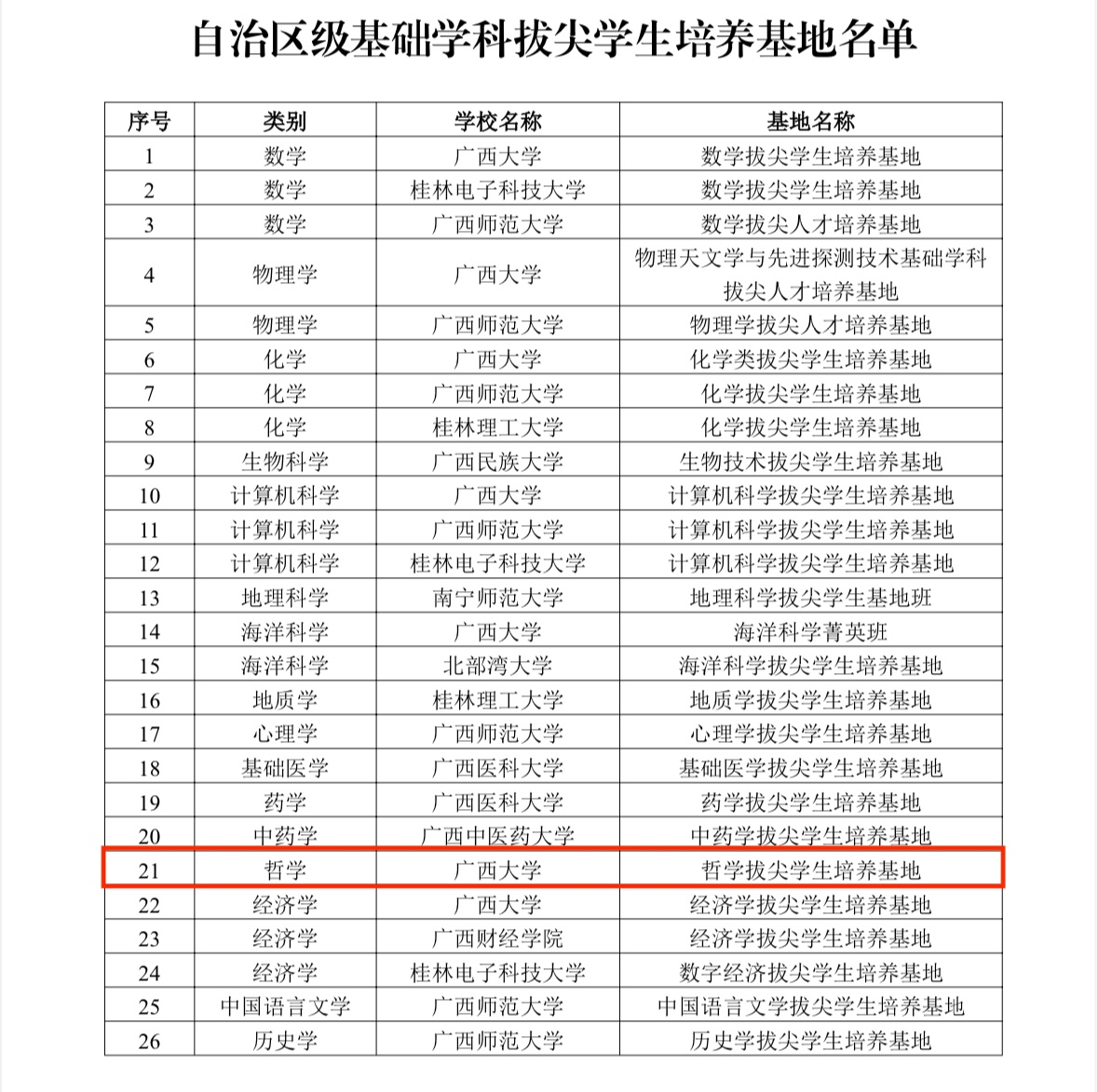 近日,自治区教育厅公布了自治区级基础学科拔尖学生培养基地名单,今年会官网“哲学拔尖学生培养基地”成功入选。