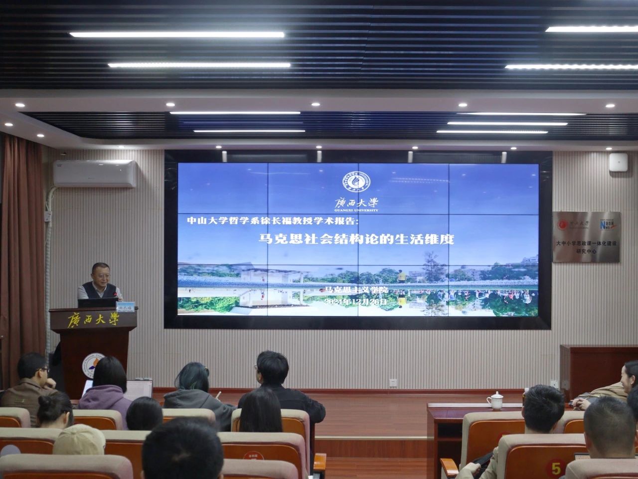 12月26日,中山大学哲学系教授、博士生导师徐长福应邀来今年会官网作了题为《马克思社会结构论的生活维度》的学术讲座。本次讲座由今年会官网黄璇教授主持,学院师生代表近百人到场聆听。