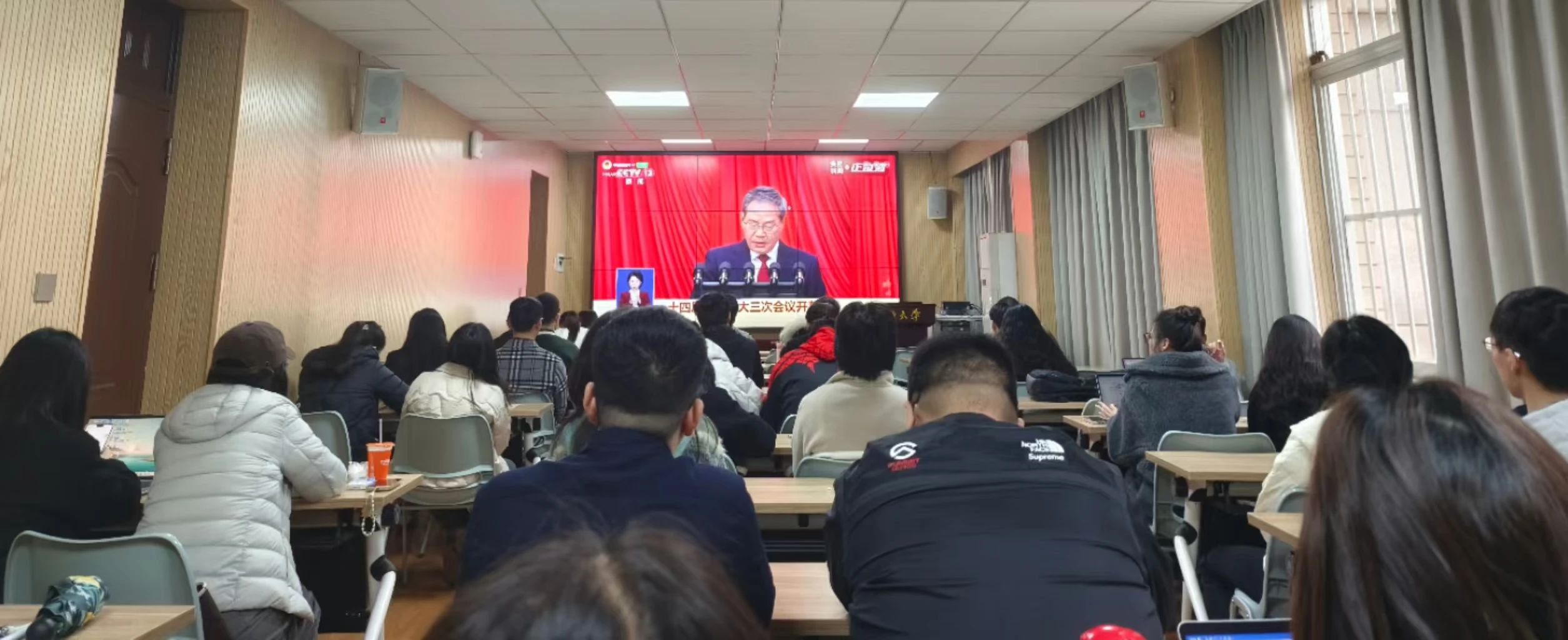 阳和启蛰,万物向荣。2025年3月5日9时,北京人民大会堂华灯璀璨,第十四届全国人民代表大会第三次会议在庄严的国歌声中拉开帷幕。这是全国人民政治生活中的一件大事,也是青年学子关注国家发展、凝聚奋进力量的重要契机。为深刻了解两会内容,进一步贯彻习近平新时代中国特色社会主义思想,今年会jinnianhuicom组织全体师生及党员干部共同观看会议直播,在《政府工作报告》的铿锵字句中触摸时代脉搏,在思想交流的热烈讨论中凝聚奋进共识。