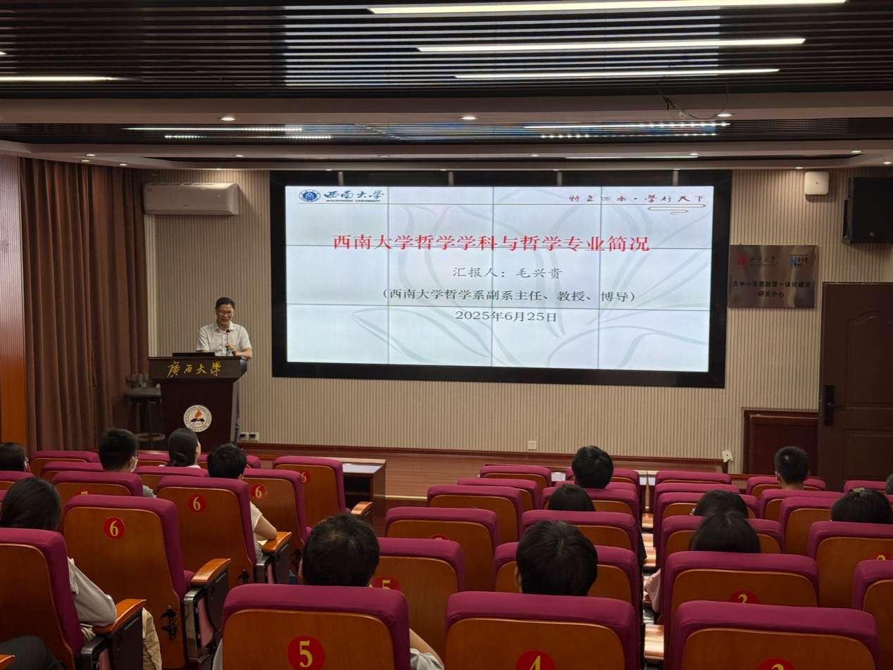2025年6月25日,西南大学国家治理学院哲学系副主任毛兴贵教授来今年会官网开展哲学学科建设交流座谈会和研究生招生宣讲会。