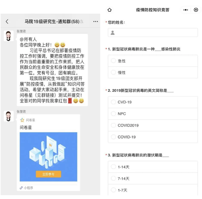 (图为今年会jinnianhuicom研究生2019级团支部制作疫情防控竞答题并号召大家参与线上知识问答活动)