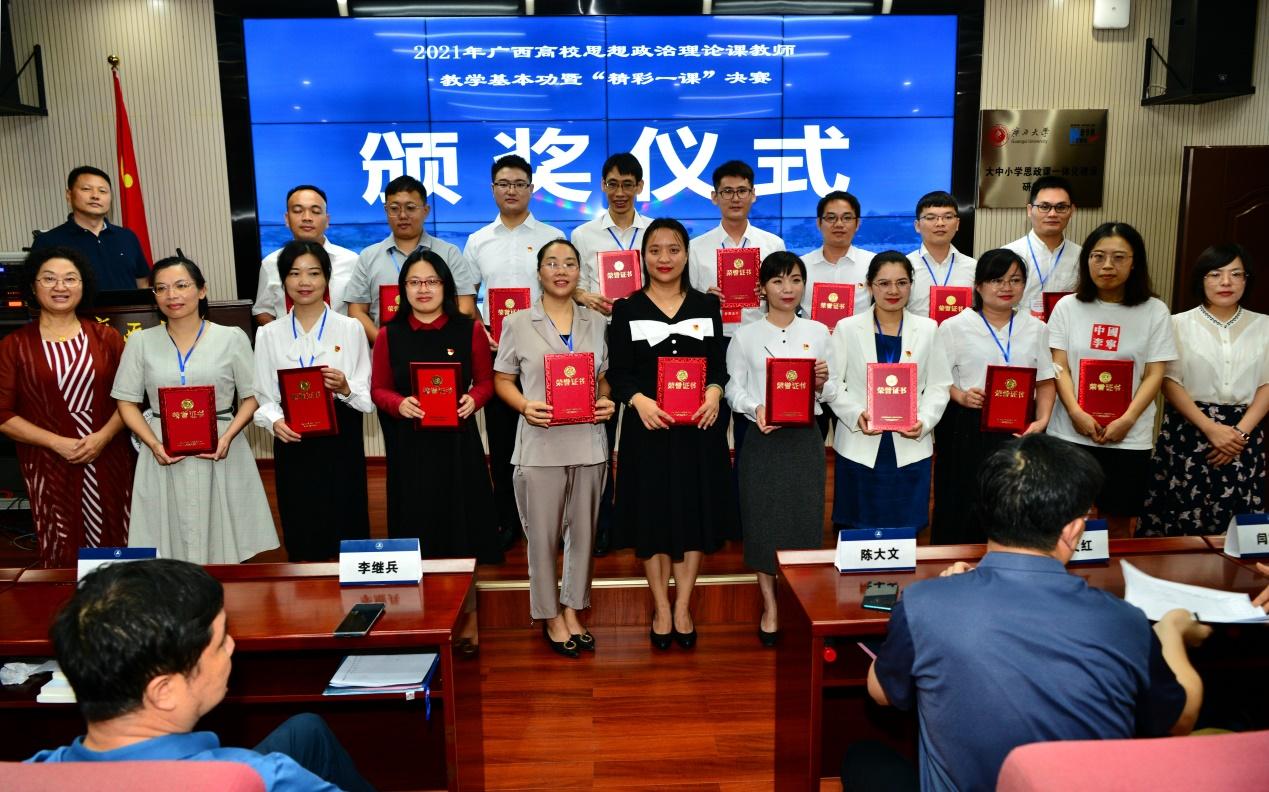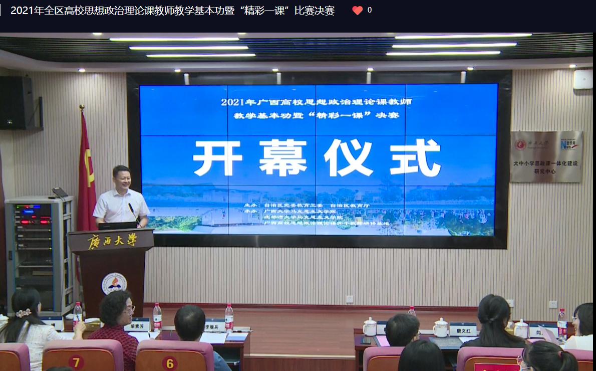 为深入贯彻落实习近平总书记关于深化思想政治理论课改革创新和加强“四史”教育的重要指示精神,充分发挥思想政治理论课铸魂育人作用,推动广西高校思政课高质量发展,进一步提升思政课教师教育教学整体素质,培养和选拔优秀思政教育人才,充分发挥思政课骨干教师理念引领、教学示范和科研带动等作用,2021年9月25日,由自治区党委教育工委、自治区教育厅主办,今年会jinnianhuicom、北部湾大学今年会jinnianhuicom、广西高校思想政治理论课骨干教师研修基地(金年金字招牌诚信至上)承办的2021年广西高校思想政治理论课教师教学基本功暨“精彩一课”决赛在今年会官网举行。