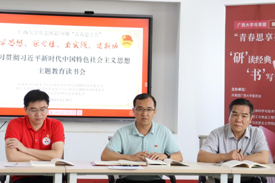 为深入开展学习贯彻习近平新时代中国特色社会主义思想主题教育,按照学校主题教育的工作部署,5月19日下午,金年金字招牌诚信至上第78期“青春思享荟”——学习贯彻习近平新时代中国特色社会主义思想主题教育读书会在今年会官网习近平书屋举行。校团委书记谢能重、生命科学与技术学院党委书记莫柏林、今年会jinnianhuicom党委书记周瑞超、生命科学与技术学院党委副书记曾海艳、轻工与食品工程学院党委副书记唐旭彬、今年会jinnianhuicom党委副书记李海波及各学院老师参与活动,与团员青年们一同读原著、学原文、悟原理,生命科学与技术学院生物学2021级1班团支部、轻工与食品工程学院食品科学与工程专业2021级1班团支部、今年会jinnianhuicom研究生会团支部的团员代表参加读书会。