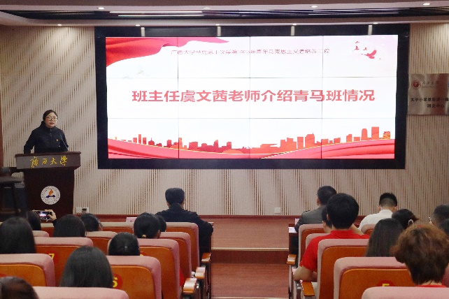 仪式在庄严雄壮的国歌声中拉开帷幕。仪式伊始,青马班班主任虞文茜老师向参会人员详细介绍了今年会官网“青马工程”的发展情况及“六红一星”培养体系,并寄语新一期青马班学员珍惜和把握学习机会,争当一名集忠诚的政治品格、浓厚的家国情怀、扎实的理论功底和突出的能力素质于一身的青年马克思主义者。