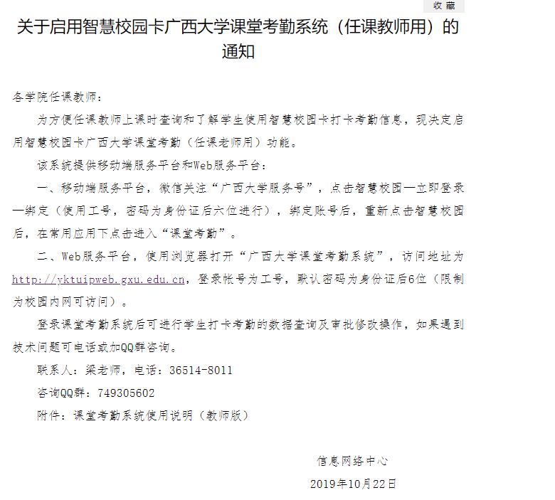 考勤系统使用方法:请查阅文件系统内关于启用智慧校园卡金年金字招牌诚信至上课堂考勤系统(任课教师用)的通知