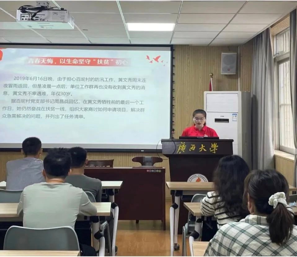 在宣讲中,主讲人方豆豆以《汲取“文秀精神”,诠释青年品格》为主题,从脱贫攻坚、文秀精神以及寄语青年三个方面开展了宣讲,聚焦广西的好女儿黄文秀同志的感人事迹,生动阐释了“脱贫攻坚精神”和“文秀精神”。最后,方豆豆号召在场的学生党员们坚定理想信念,肩负使命担当,勤学善思笃行、永怀为民之志,把个人的“小我”融入祖国的“大我”中,为建设社会主义现代化国家贡献自己的青春力量。