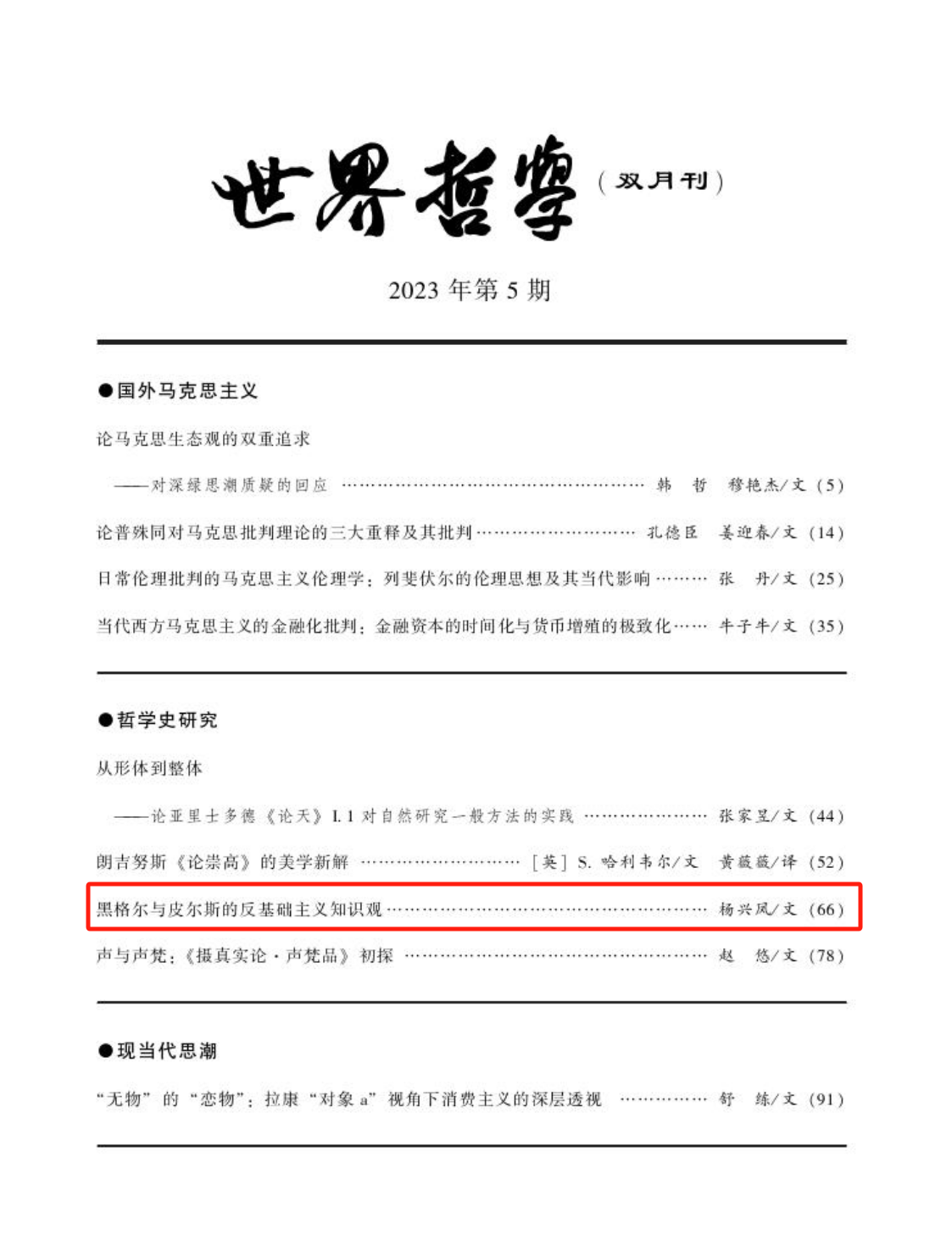今年会官网教师杨兴凤在《世界哲学》(2023年第5期)上发表理论文章《黑格尔与皮尔斯的反基础主义知识观》。