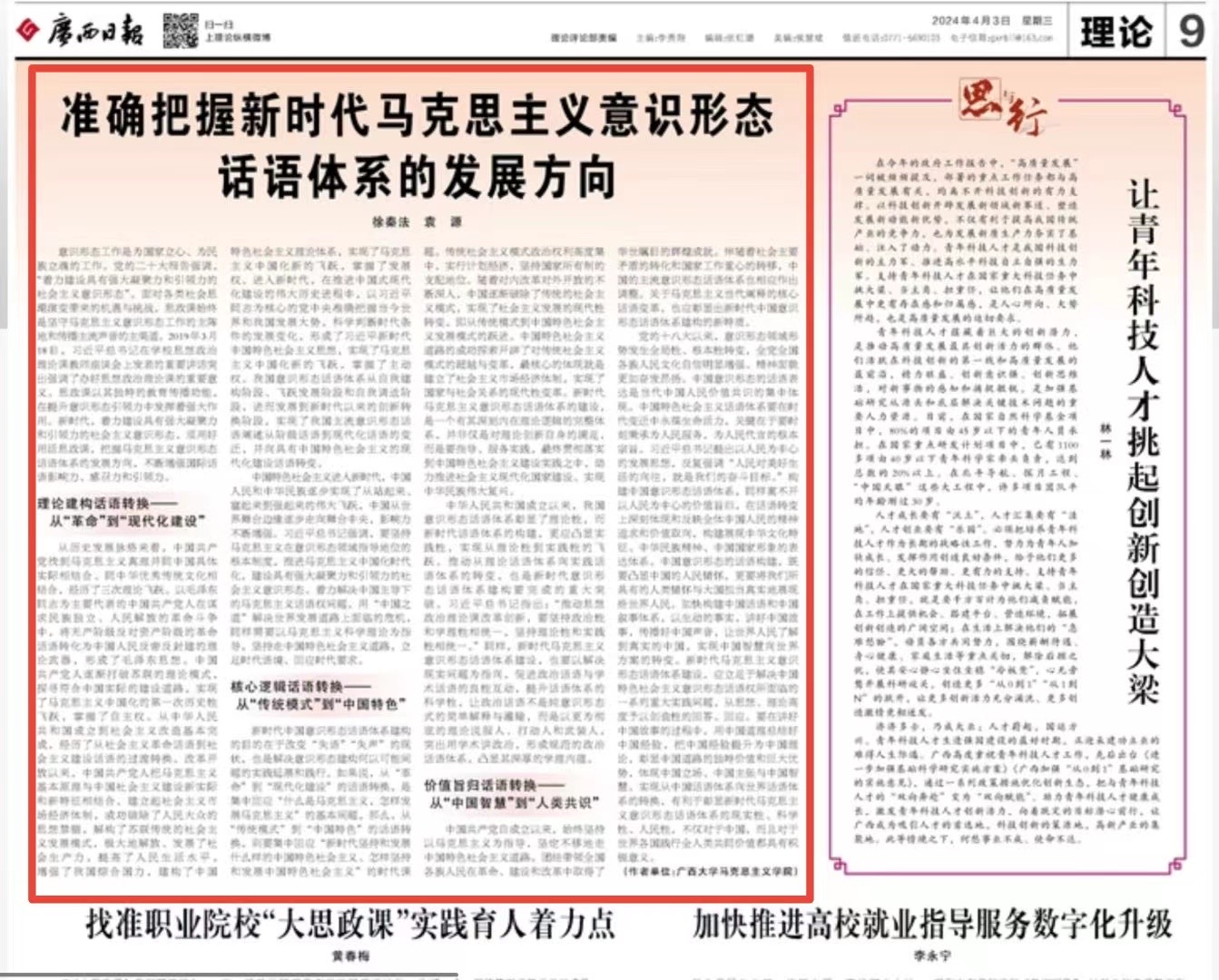 2024年4月3日,《广西日报》(第九版)刊发了今年会官网徐秦法教授、硕士生袁源的理论文章《准确把握新时代马克思主义意识形态话语体系的发展方向》。