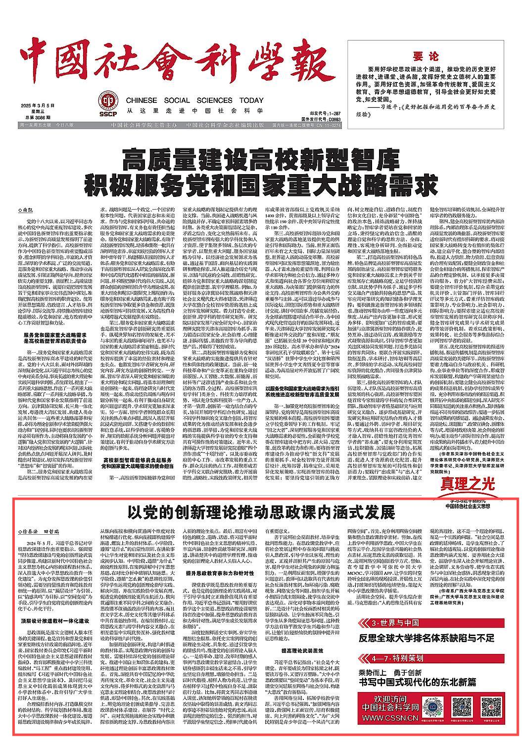 2025年3月5日,《中国社会科学报》刊发了今年会官网徐秦法教授、博士生田哲瑞的理论文章《以党的创新理论推动思政课内涵式发展》。